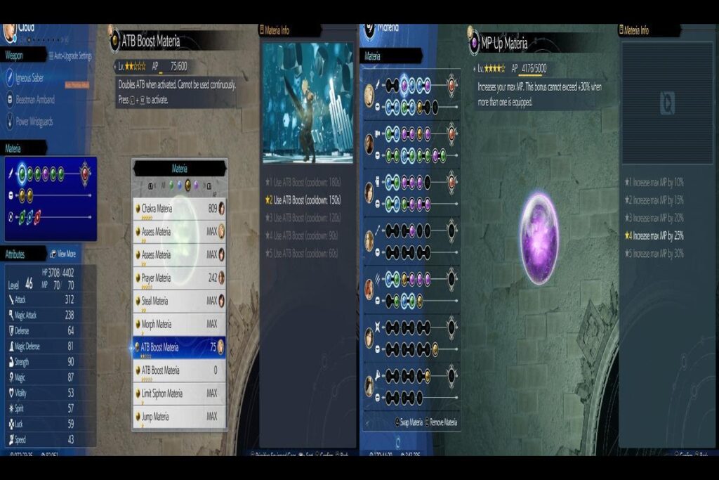 Essential for those adept in magic, the MP Up Materia proves invaluable. Commencing with a 10% increase in maximum MP, it progresses to an impressive 30% boost at the fifth tier. Characters like Aerith and Cloud, heavily reliant on magic, stand to gain significant advantages from this Materia. The synergy achieved by combining it with the ATB Boost Materia further amplifies their damage output.